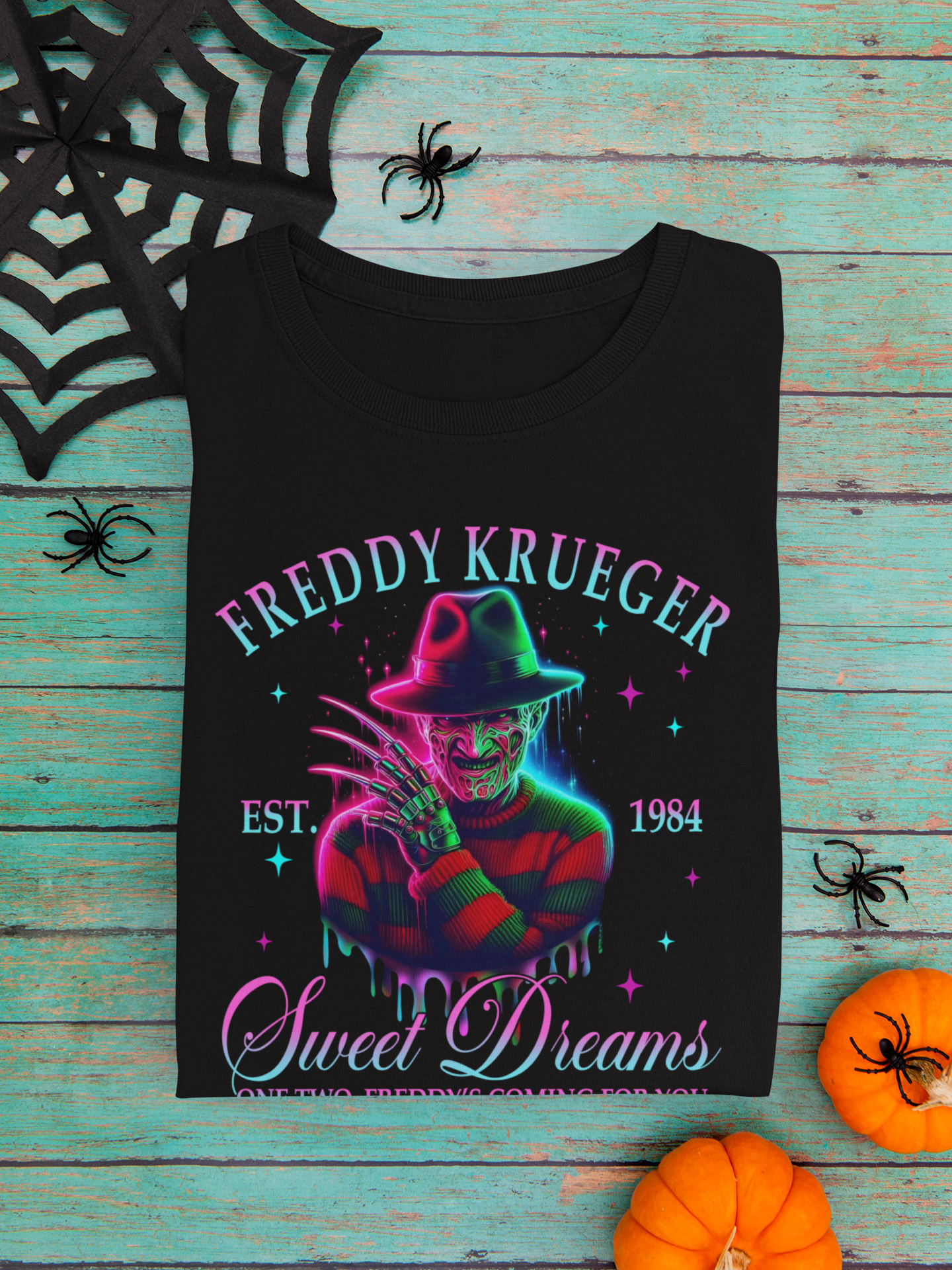Step into a playful night of spooky fun with the Sweet Dreams shirt. Featuring an iconic character glowing in neon, this tee brings a vibrant twist to classic Halloween vibes. Perfect for those who love to mix a little eerie with a lot of style and personality. Get ready to turn heads and spark smiles wherever you go!
