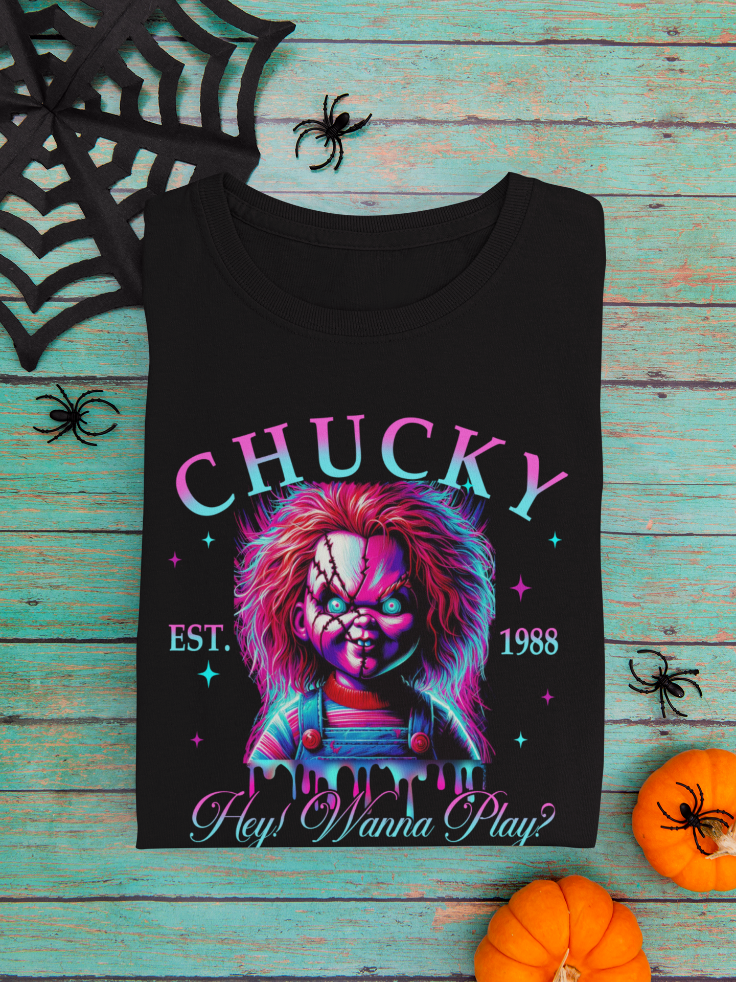 Step into a playful night of spooky fun with the Wanna Play shirt. Featuring an iconic character glowing in neon, this tee brings a vibrant twist to classic Halloween vibes. Perfect for those who love to mix a little eerie with a lot of style and personality. Get ready to turn heads and spark smiles wherever you go!